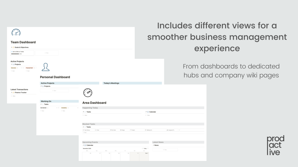 This workspace is packed with templates not only for internal pages like projects, areas or meetings but for invoices, proposals and client portals as well. Make client onboarding easier and more effective by sharing key information with your clients and keeping them in the loop about your work.